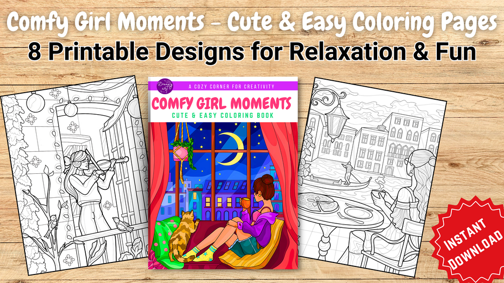 "Relax and unwind with 'Comfy Girl Moments' – a cozy collection of 8 adorable coloring pages featuring cute and simple designs for stress relief and relaxation. These printable pages are perfect for adults and teens who love easy, fun, and mindful coloring!"