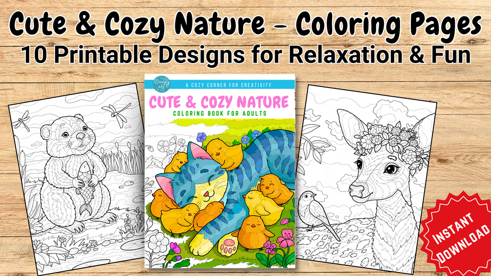 A calming collection of 10 printable coloring pages featuring adorable animals and cozy outdoor scenes. Perfect for adults and teens seeking creativity and relaxation.